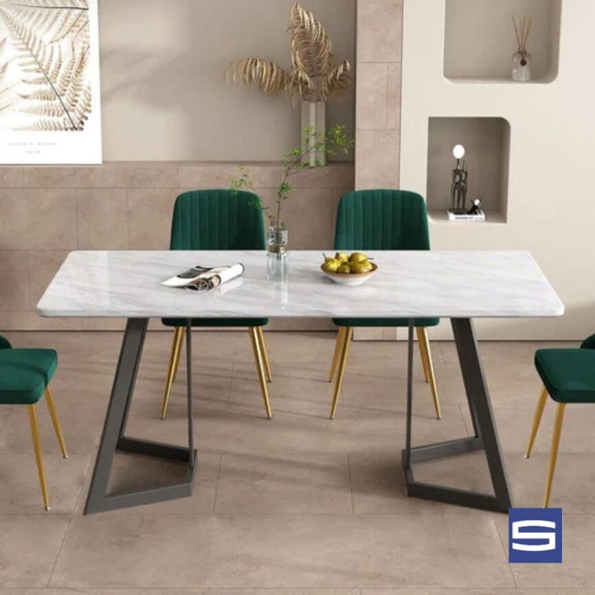 The dining table has a place, in the home that’s more, than a piece of furniture. Dining table is a space where connection, routine and togetherness happen. The dining table brings family members together for meals. The dining table creates moments of conversation, bonding and shared experiences that build relationships over time. The dining table also works as a hub for celebrations, guest conversations, children’s activities, work and decision making that shape family life. The dining table sets the look of the home. Makes the space feel welcoming and balanced. The dining table helps people sit comfortably and keep posture while they eat. The dining table encourages people to stay at the table and enjoy their meals.The dining table is one of the parts of a house.Therefore , it is important to pick the right dining table.This dining table is a refined expression of modern luxury, designed to become the visual and emotional centre of the dining space. The smooth marble-look tabletop brings a sense of calm sophistication, with subtle veining that adds depth without overpowering the room. Its clean, rectangular form is perfectly balanced by the elegant metal base, finished in a warm, brushed tone that introduces a touch of glamour while maintaining a contemporary edge. The structured base not only provides excellent stability but also creates a light, architectural presence, allowing chairs to sit comfortably without visual clutter. Ideal for both everyday dining and special gatherings, this table offers generous surface space for shared meals, conversations, and celebrations.